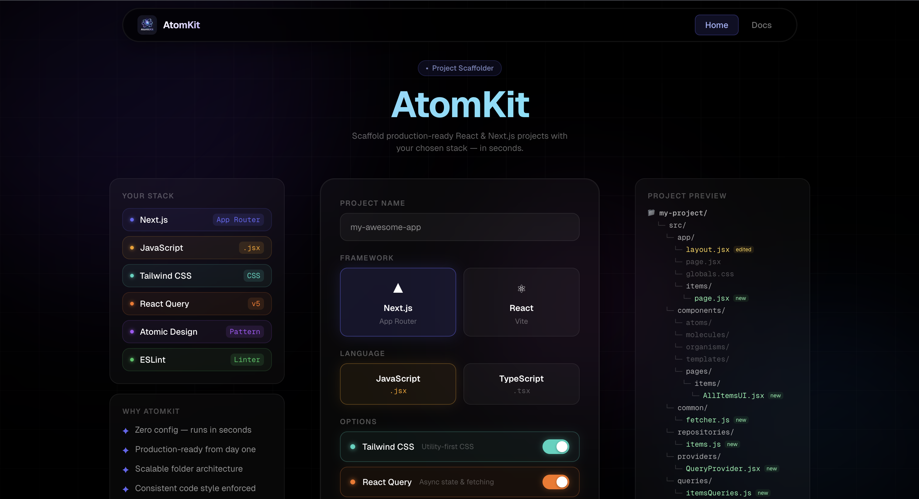 Scaffolds fully structured, production-ready React and Next.js projects with Atomic Design folder structure, optional Tailwind CSS preconfigured with PostCSS, optional React Query with complete 5-layer data architecture, and ESLint configured out of the box.
