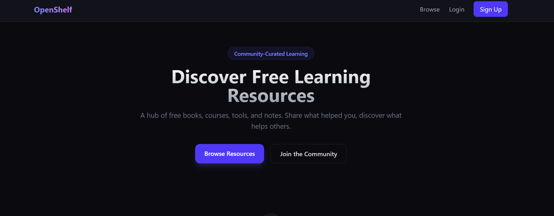 A full-stack platform where people share, discover, and curate free learning resources — books, courses, tools, articles, videos, and notes. Features resource browsing with pagination, debounced search, category and type filters, sorting by newest/popular/trending, JWT authentication, upvoting, bookmarking, and user profiles.